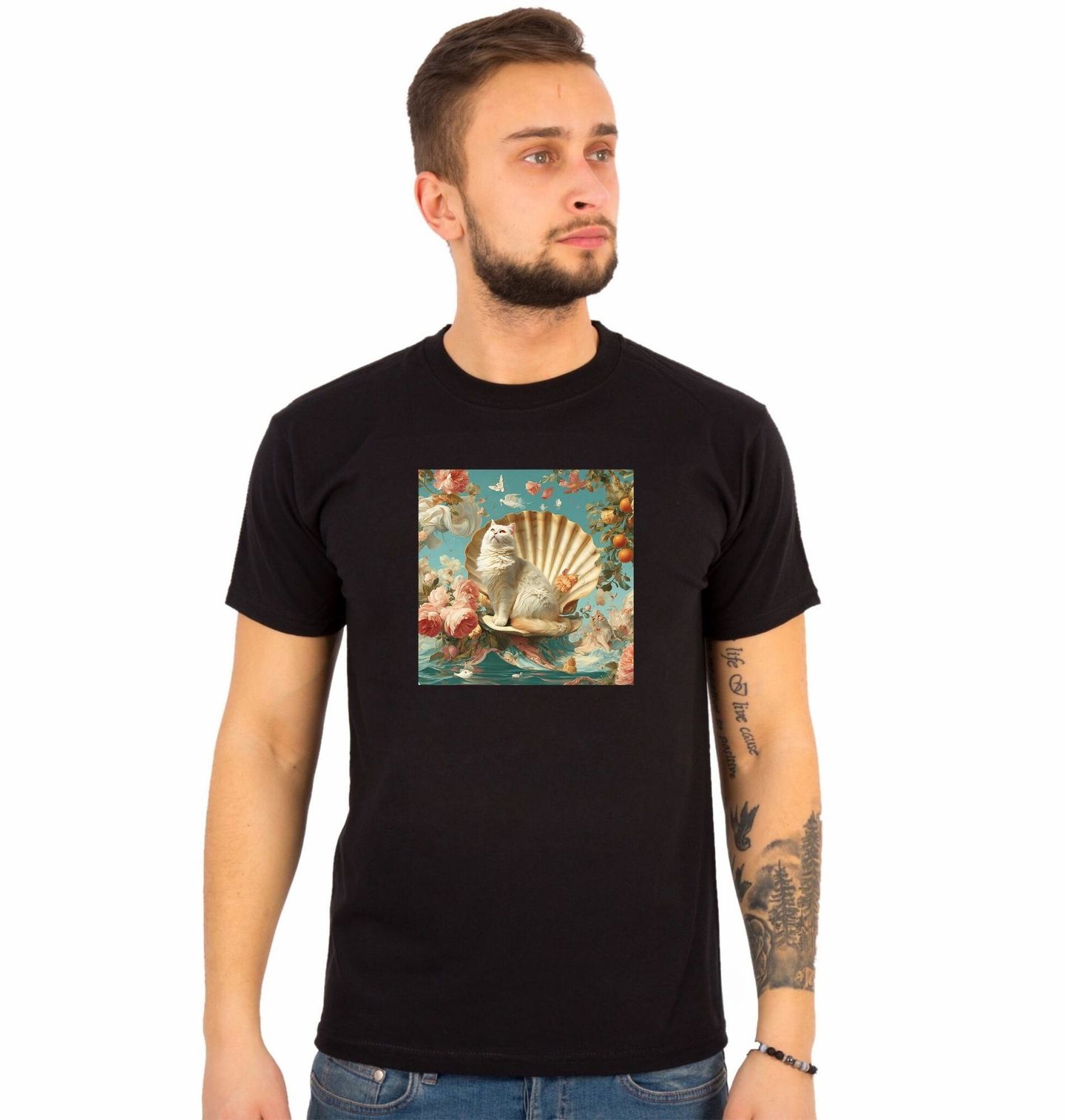 Pánské tričko Zrození Kočičí Bohyně. Motiv je zároveň hravou parodií na slavné renesanční dílo „Zrození Venuše“ od Sandra Botticelliho – jen místo bohyně je zde majestátní chlupatá bílá kočka a velká otevřená mušle. Kolem se vznášejí jemné květiny, ptáci a lehký závoj, takže celý obraz působí romanticky, něžně a trochu božsky.