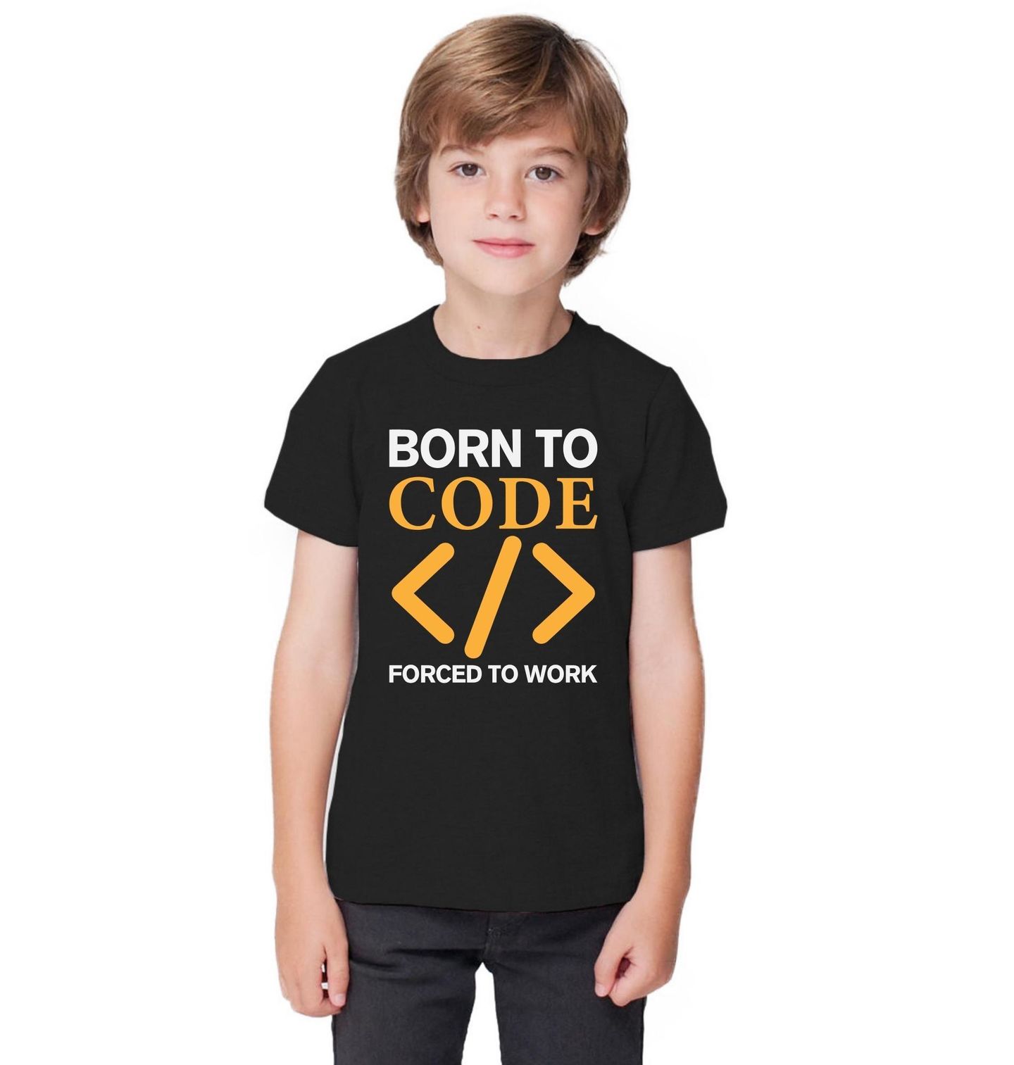 Dětské tričko Zrozený ke kódování, Nucený pracovat. „Born to Code </> Forced to work“. Výrazný geek motiv s jasným poselstvím, které každý programátor okamžitě pochopí. Stylová kombinace textu a symbolů kódu vystihuje realitu IT světa – vášeň pro programování versus nutnost chodit do práce.