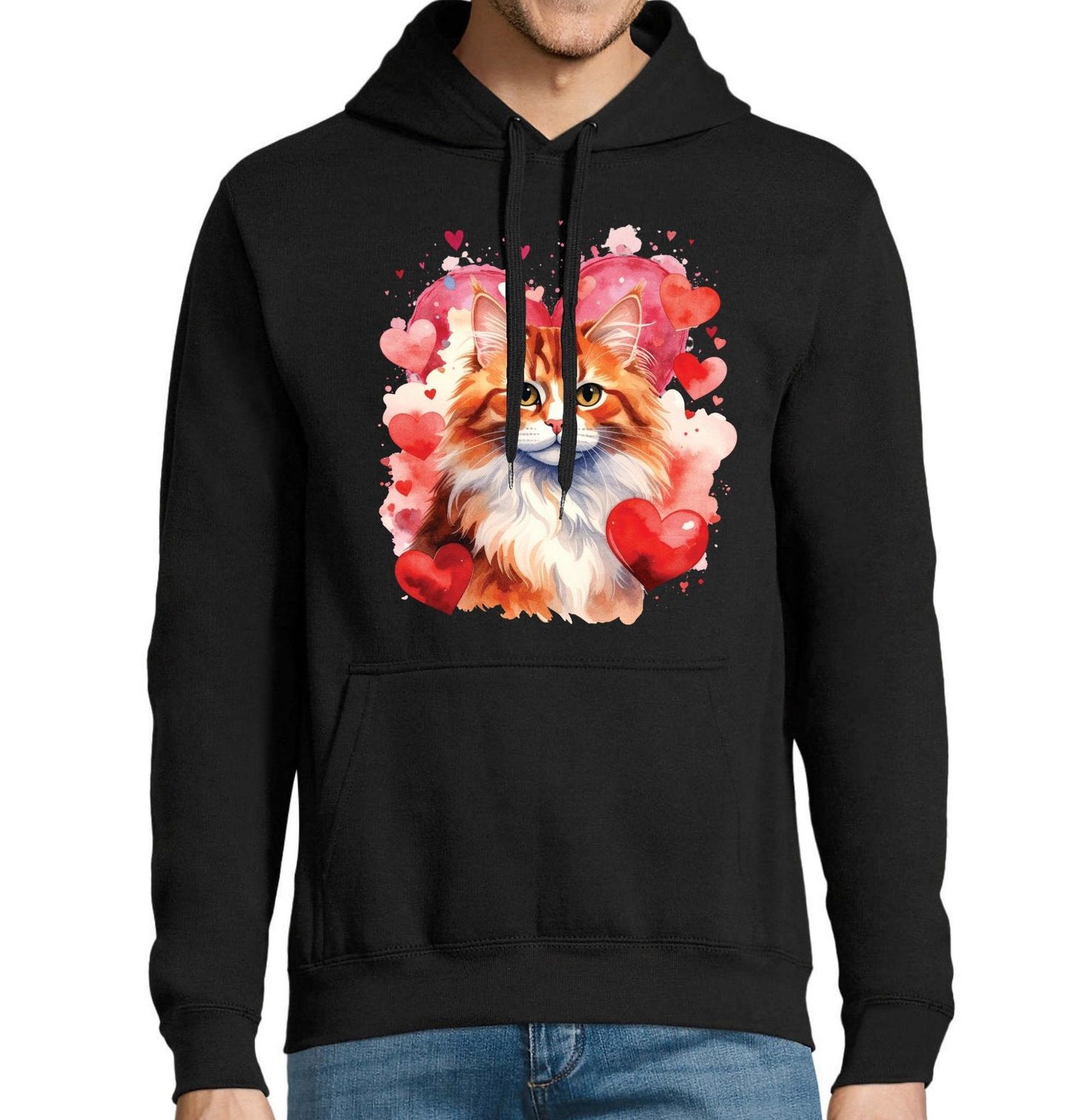 Pánská mikina Zrzavá Kočka mezi Srdci. Romantický a hřejivý motiv zachycuje kočka v podobě zrzavé mourovaté krásky s bohatou srstí a jemným pohledem. Ilustrace obklopená srdci vyzařuje lásku, klid a něhu, kterou kočka přináší do každodenního života svých majitelů. Teplé tóny oranžové a červené vytvářejí harmonickou atmosféru plnou emocí.