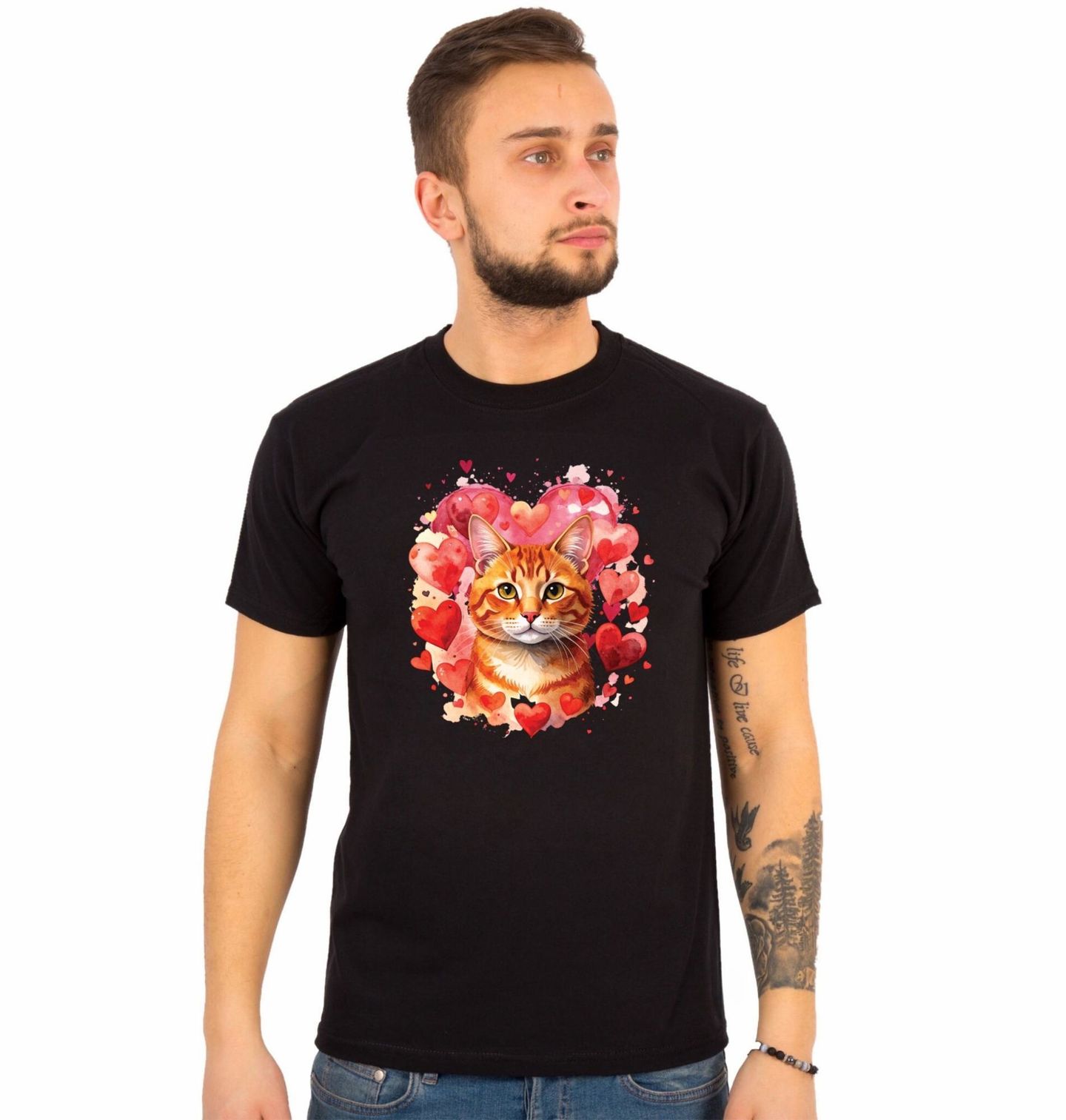 Pánské tričko Zrzavá Mourovatá Kočka mezi Srdci. Ilustrace představuje zrzavou mourovatou kočka, typickou pro evropskou krátkosrstou (domácí) rasu, známou svou přátelskou povahou a vřelým pohledem. Design působí jemně a romanticky, ideální pro všechny, kteří mají ke kočkám silný citový vztah. Kočka zde symbolizuje domov, pohodu a bezpodmínečnou lásku.