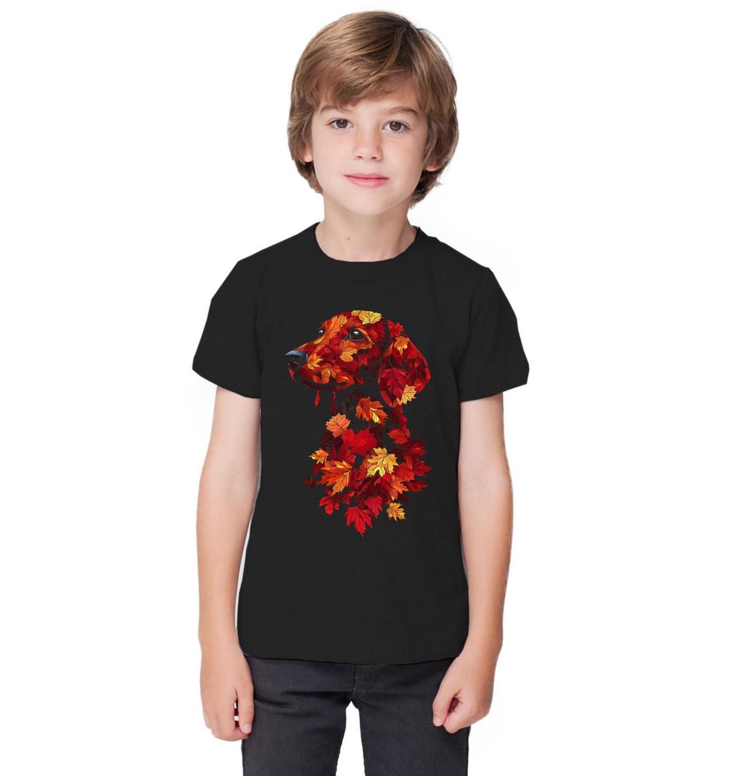 Dětské tričko Zrzavý Jezevčík mezi Listy. Barevné listí, chladné ráno a věrný jezevčík po boku – přesně tak vypadá dokonalý podzim pro každého správného pejskaře. Tento umělecký pes složený z podzimních listů je poctou kouzlu přírody i hlubokému poutu mezi člověkem a jeho psem.