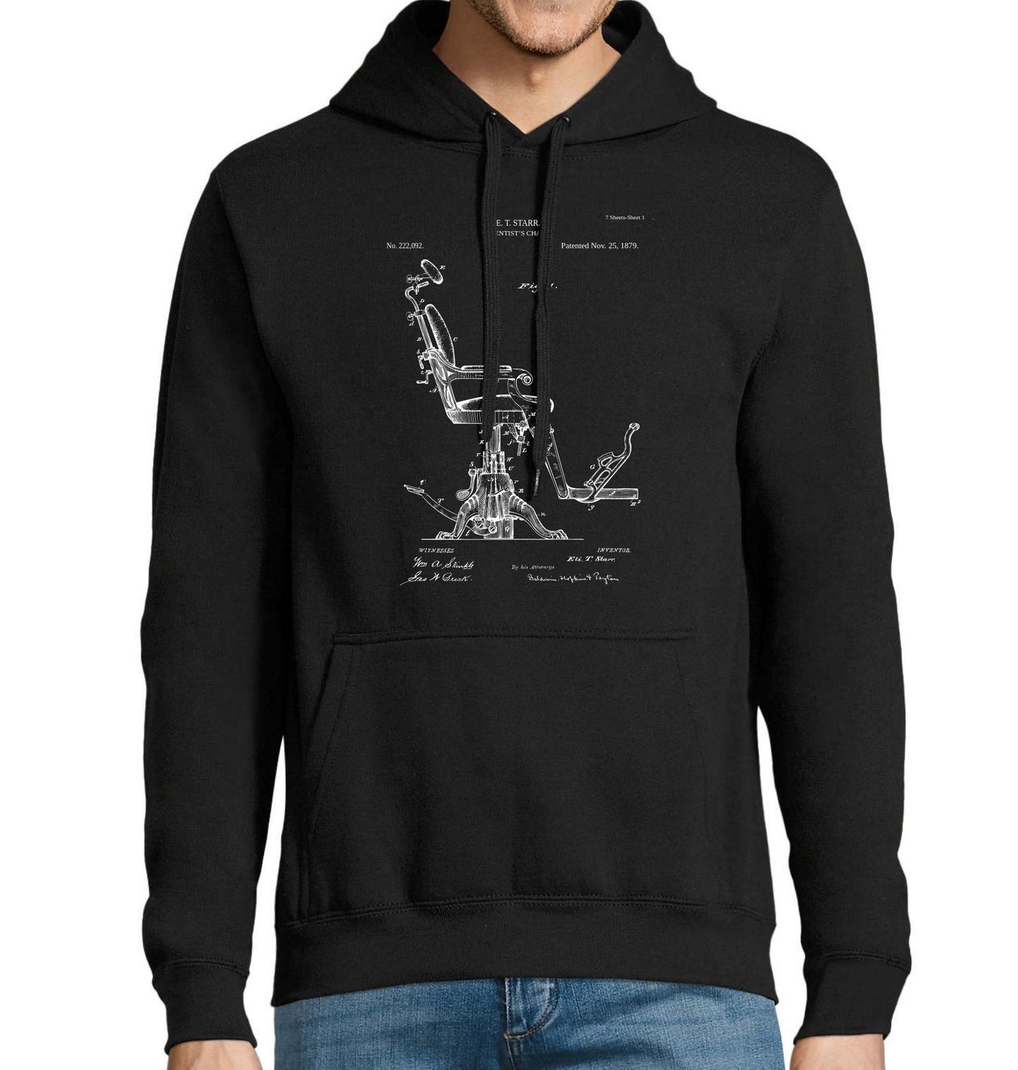 Pánská mikina Zubařské Křeslo Patent E. T. Starr. Patent zubařského křesla od E. T. Starra z roku 1879. Tento patent přinesl revoluci v komfortu a nastavitelnosti zubařských křesel, jak je známe dnes. Autentický výkres patentu dodává tričku technický i retro vzhled, který ocení nejen fanoušci stomatologie, ale i lékaři a milovníci zdravotnictví.