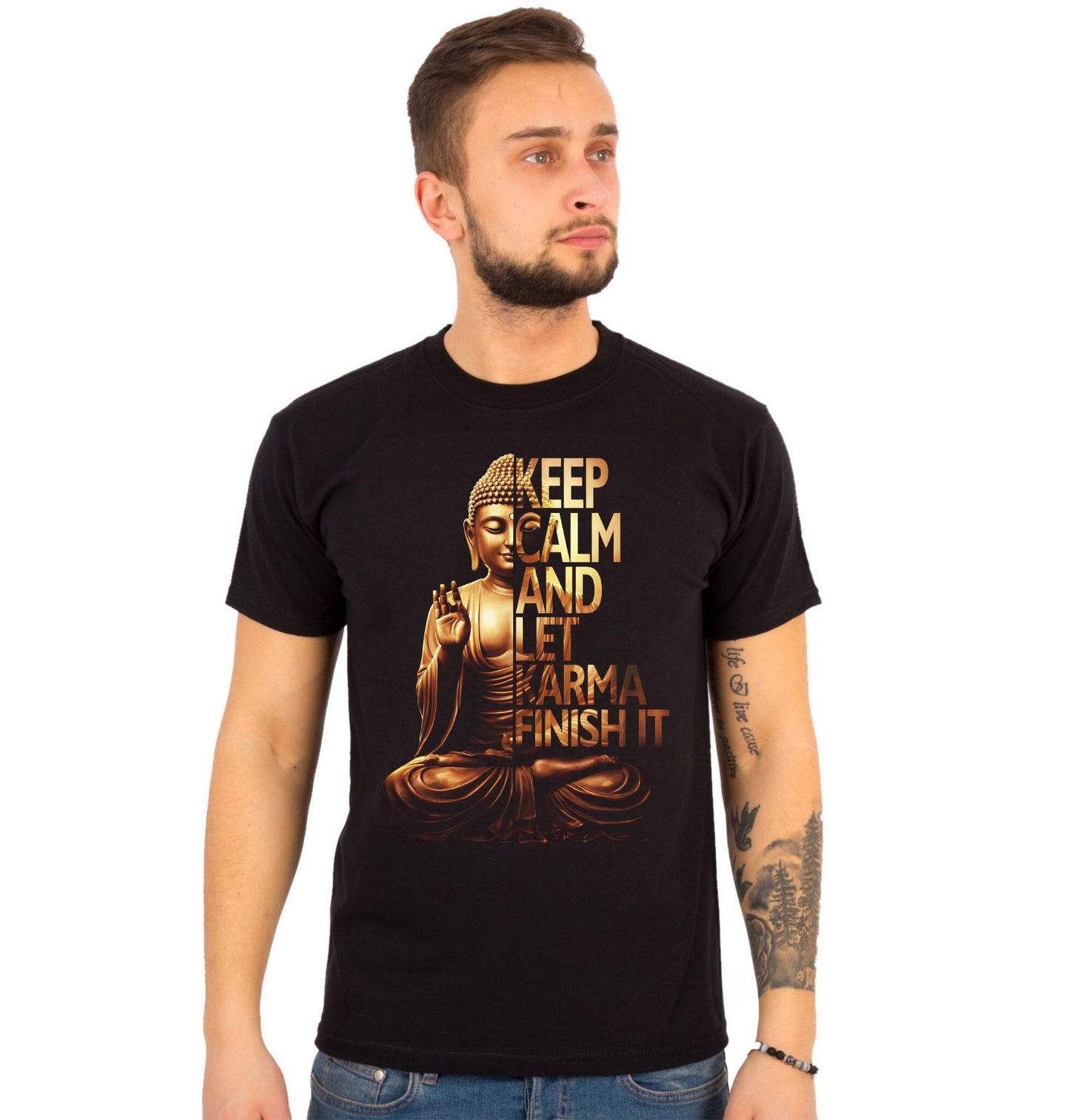 Pánské tričko Zůstaň v klidu a nech karmu, ať to dokončí. „Keep Calm and Let Karma Finish It“. Stylový a výrazný motiv, který spojuje klid, sílu a lehkou dávku drsného humoru – budha v meditativní pozici doplněný moderním textem vytváří jedinečný kontrast mezi duchovnem a realitou života. Detailně zpracovaný buddha symbolizuje vnitřní klid, zatímco výrazný nápis dodává celému designu moderní a lehce provokativní nádech. Ideální pro ty, kdo chtějí spojit styl, nadhled a hlubší myšlenku.