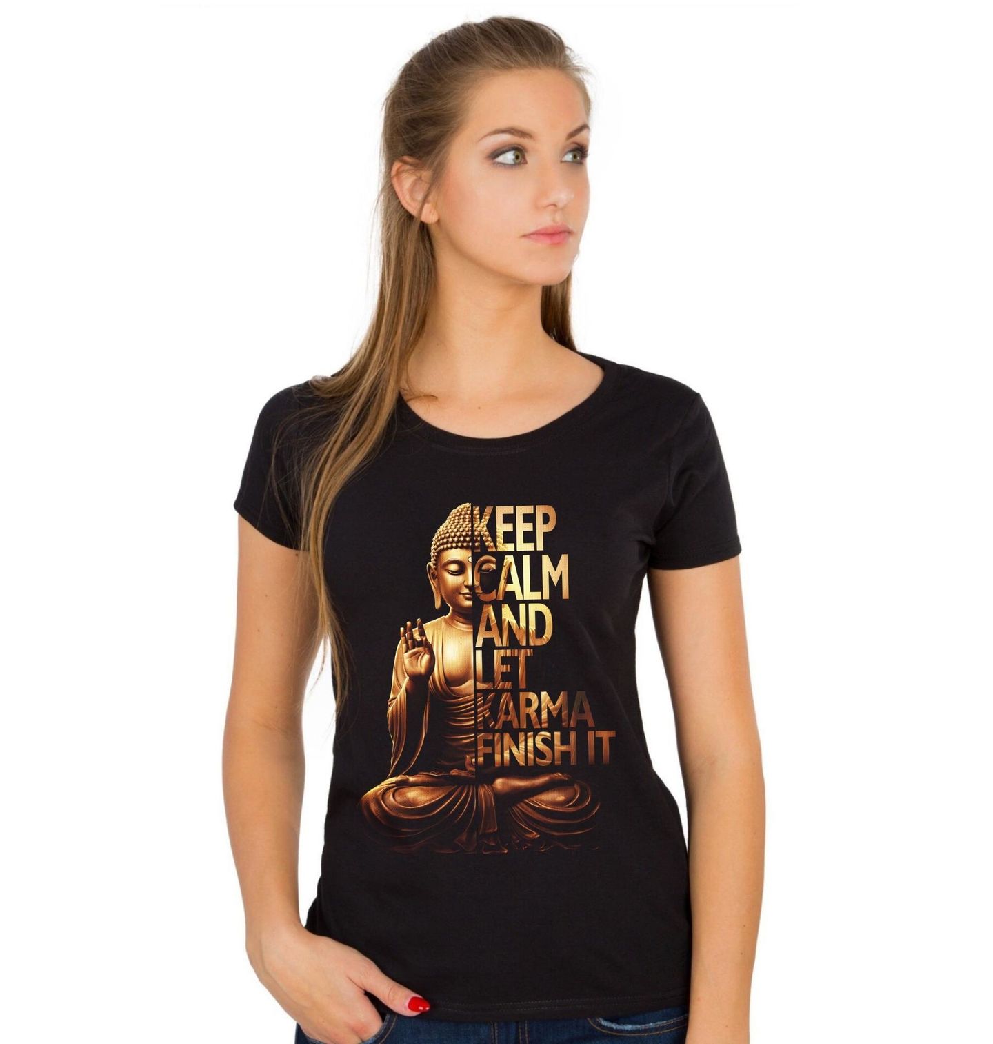 Dámské tričko Zůstaň v klidu a nech karmu, ať to dokončí. „Keep Calm and Let Karma Finish It“. Stylový a výrazný motiv, který spojuje klid, sílu a lehkou dávku drsného humoru – budha v meditativní pozici doplněný moderním textem vytváří jedinečný kontrast mezi duchovnem a realitou života. Detailně zpracovaný buddha symbolizuje vnitřní klid, zatímco výrazný nápis dodává celému designu moderní a lehce provokativní nádech. Ideální pro ty, kdo chtějí spojit styl, nadhled a hlubší myšlenku.