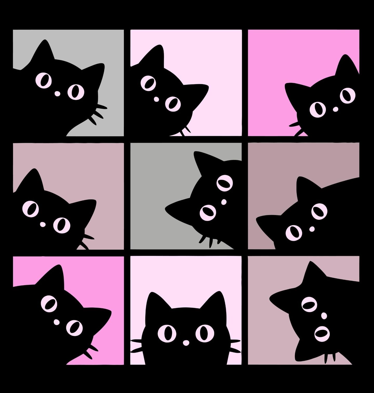 Pánské tričko Zvědavá Koťata. Ilustrace zobrazuje opakující se siluetu, kterou je kočka, vykukující z různých směrů v pravidelném rozložení. Každé okénko přináší trochu jiný výraz a úhel, což vytváří dynamický a zábavný celek. Minimalistický styl v kombinaci s jemnými barevnými tóny působí moderně a zároveň velmi příjemně na pohled. Kočka zde symbolizuje zvědavost, hravost a radost z objevování.