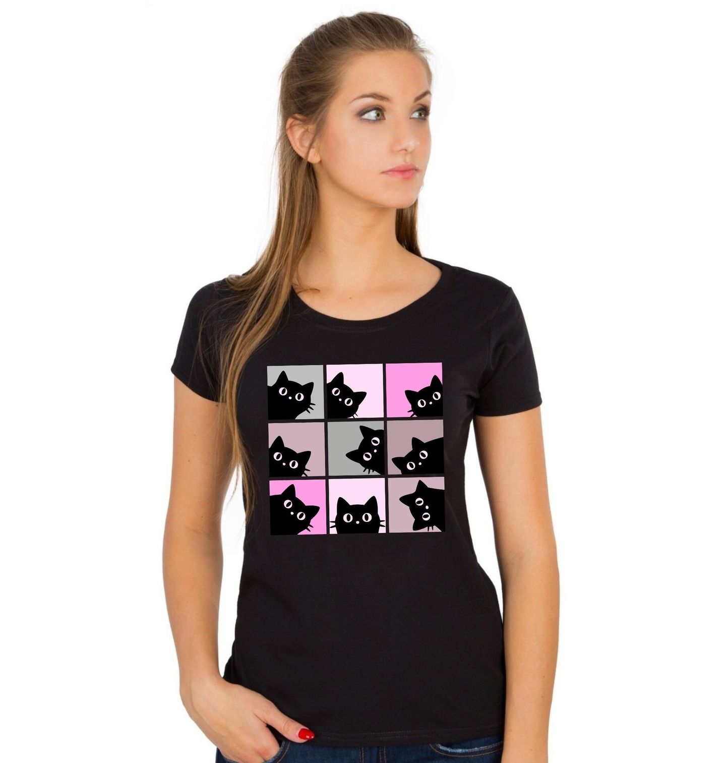 Dámské tričko Zvědavá Koťata. Ilustrace zobrazuje opakující se siluetu, kterou je kočka, vykukující z různých směrů v pravidelném rozložení. Každé okénko přináší trochu jiný výraz a úhel, což vytváří dynamický a zábavný celek. Minimalistický styl v kombinaci s jemnými barevnými tóny působí moderně a zároveň velmi příjemně na pohled. Kočka zde symbolizuje zvědavost, hravost a radost z objevování.