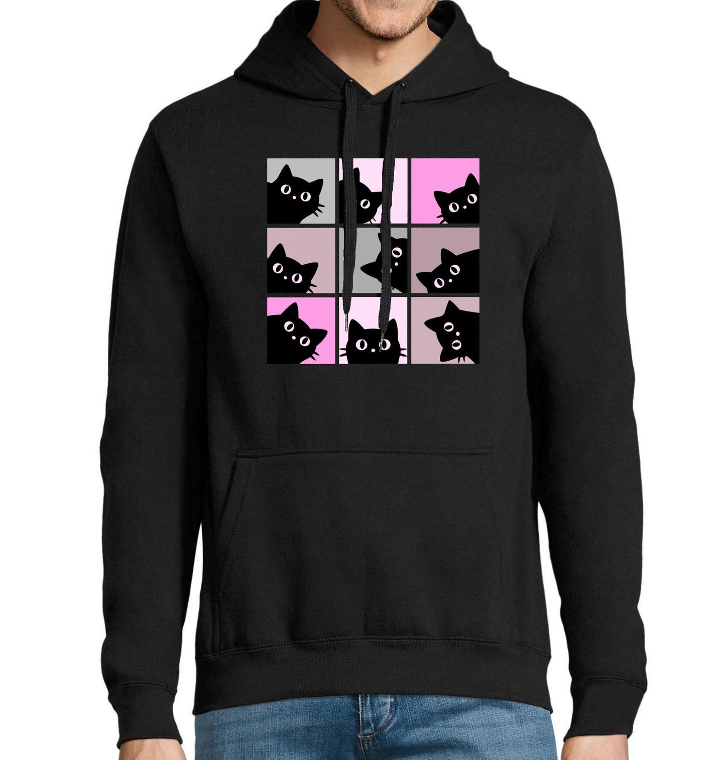 Pánská mikina Zvědavá Koťata. Ilustrace zobrazuje opakující se siluetu, kterou je kočka, vykukující z různých směrů v pravidelném rozložení. Každé okénko přináší trochu jiný výraz a úhel, což vytváří dynamický a zábavný celek. Minimalistický styl v kombinaci s jemnými barevnými tóny působí moderně a zároveň velmi příjemně na pohled. Kočka zde symbolizuje zvědavost, hravost a radost z objevování.
