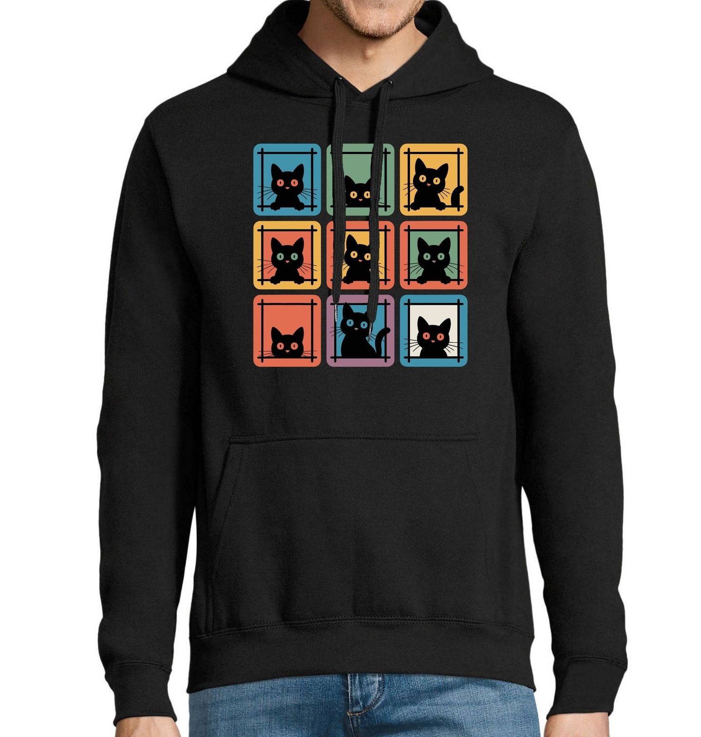 Pánská mikina Zvědavé Kočky v Okně. Ilustrace zobrazuje opakující se siluetu, kterou je kočka vykukující z rámečku připomínajícího okno. Každé pole má jinou barvu i výraz, což vytváří živý a dynamický celek. Pop art inspirace a kontrastní barevná paleta dodávají designu svěží a zábavný charakter. Kočka zde působí zvědavě, hravě a přátelsky, jako by pokaždé nahlížela do světa z jiného úhlu.