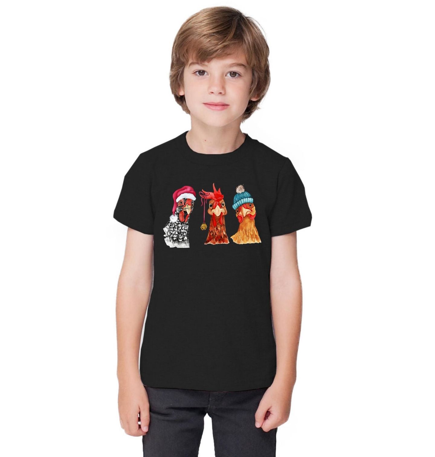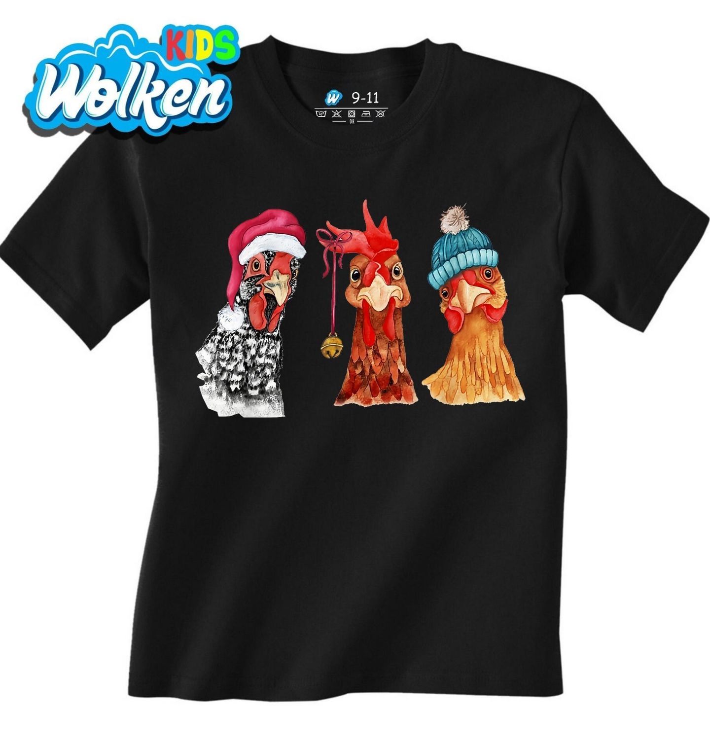 Dětské tričko Zvědavé Vánoční Slepice. Veselý motiv, kde slepice slaví Vánoce s pořádnou dávkou originality a humoru. Tři výrazné slepice s čepicemi a zvonečkem přinášejí sváteční náladu s nadsázkou a jedinečným šarmem. Ideální pro každého, kdo miluje zvířata, slepice, Vánoce a neotřelé ztvárnění sváteční atmosféry.