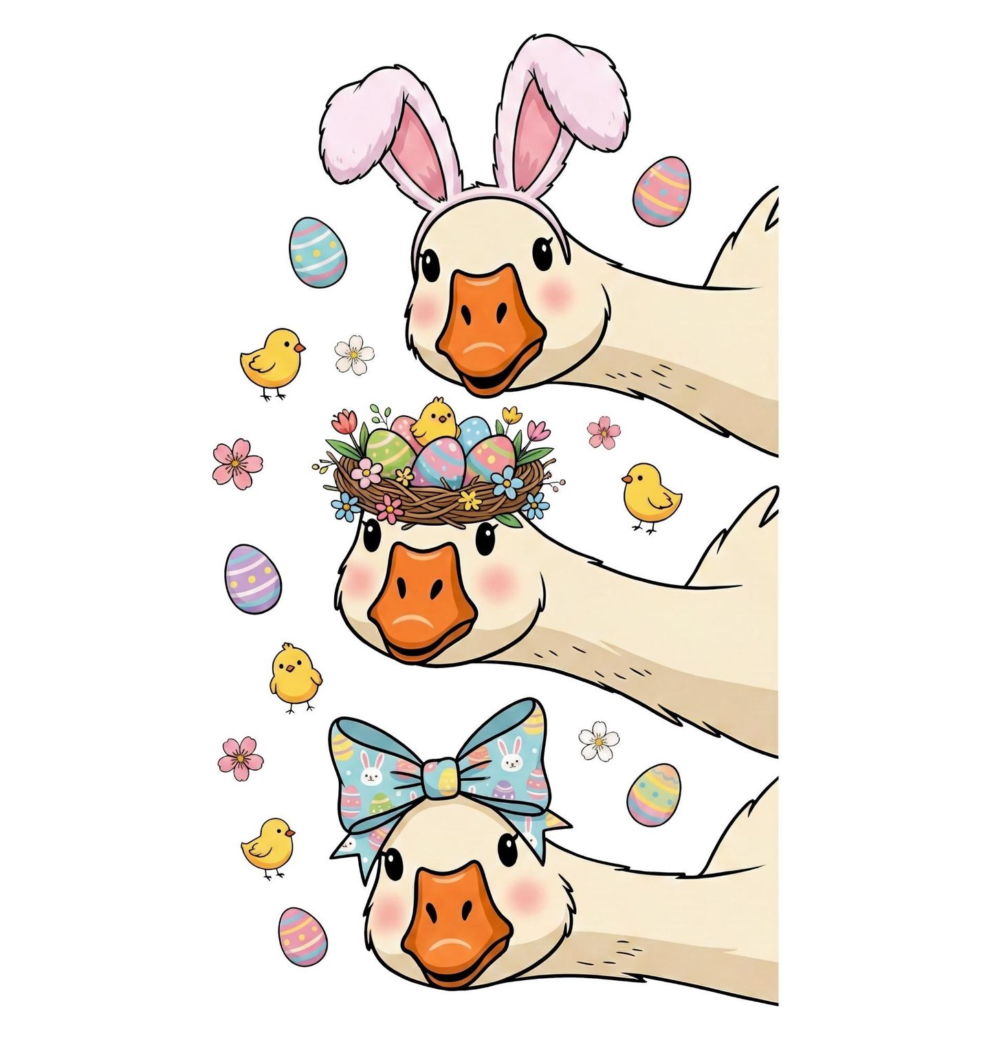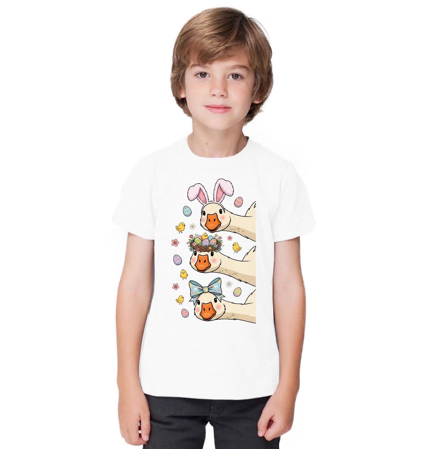 Dětské tričko Zvědavé Velikonoční Husy. Hravý a veselý motiv zobrazuje roztomilá husa ve třech variantách s velikonočními doplňky, jako jsou ouška, květinová korunka a mašle. Barevná vajíčka, kuřátka a květiny dotvářejí kouzelnou atmosféru, kterou přinášejí Velikonoce. Tento design je ideální pro všechny, kdo milují jarní motivy a roztomilé ilustrace. Každá husa má svůj jedinečný styl, což dodává motivu hravost a originalitu.