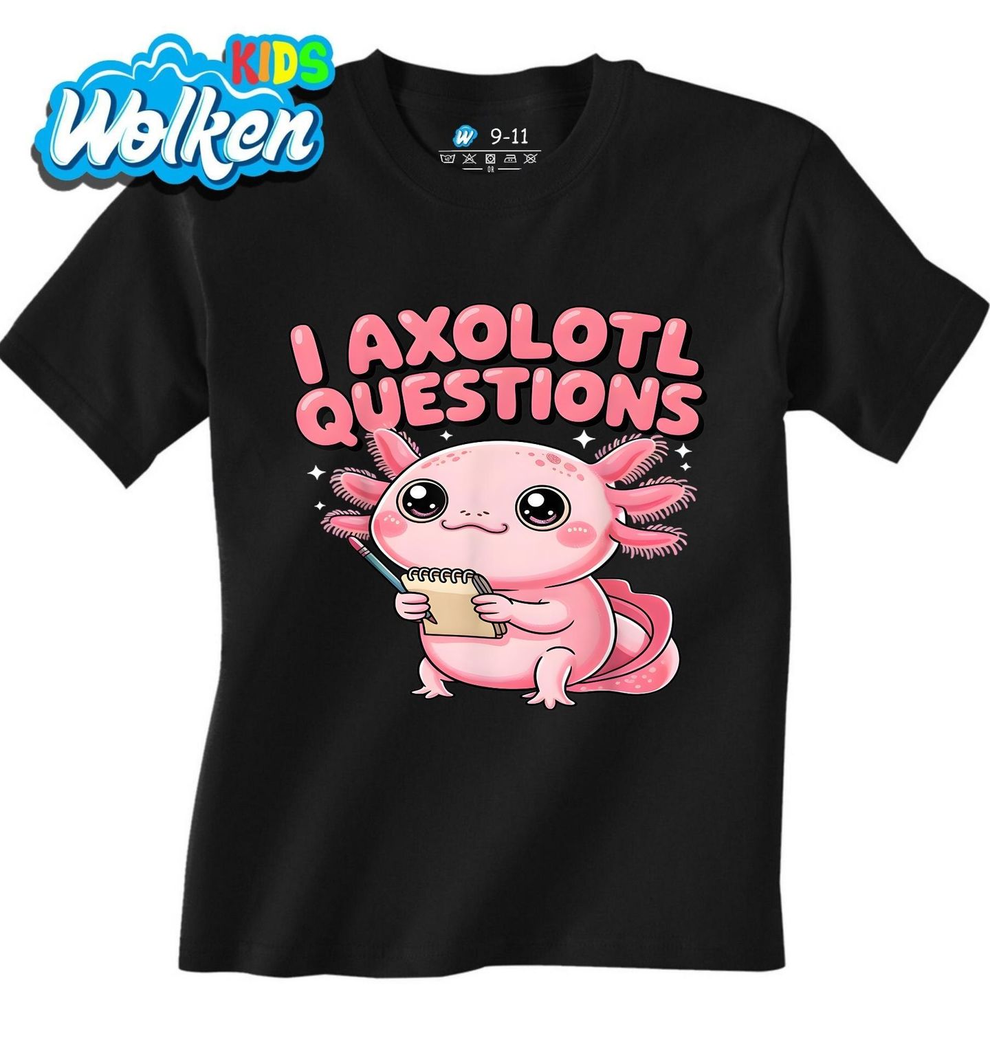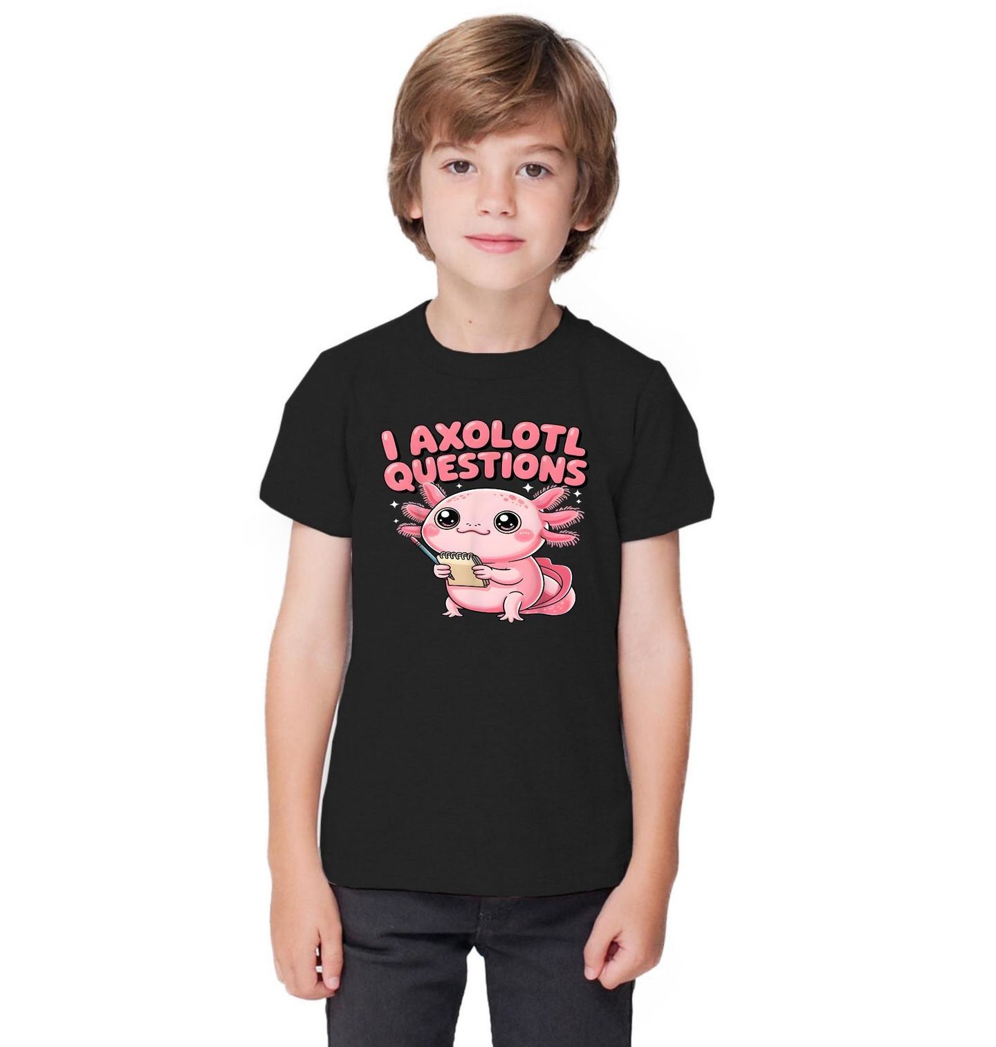Dětské tričko Zvědavý Axolotl. Text „I Axolotl Questions“ je anglický slovní hříčka: „I ask a lot of questions“ = „Pokládám hodně otázek“. Axolotl je fascinující mlok, který si získal srdce lidí po celém světě díky svému neodolatelnému vzhledu – a teď může zdobit i tvůj oblíbený kousek oblečení.