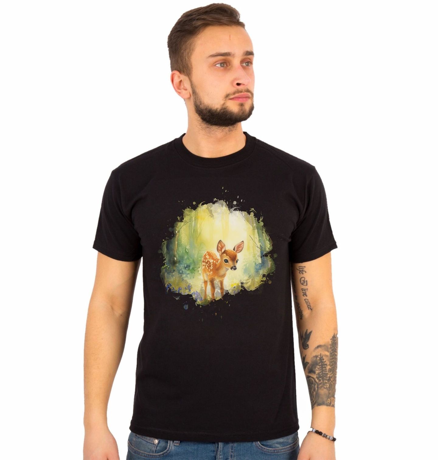 Pánské tričko Zvědavý Koloušek v Lese. Něžný akvarelový motiv zachycuje malého koloucha, který stojí v tichém světle probouzejícího se les. Jemné barvy, měkké světlo a drobné květy kolem vytvářejí pohádkovou atmosféru plnou klidu a bezpečí. Tento roztomilý jelen působí nevinně a laskavě, jako by právě vykročil z kouzelného příběhu.