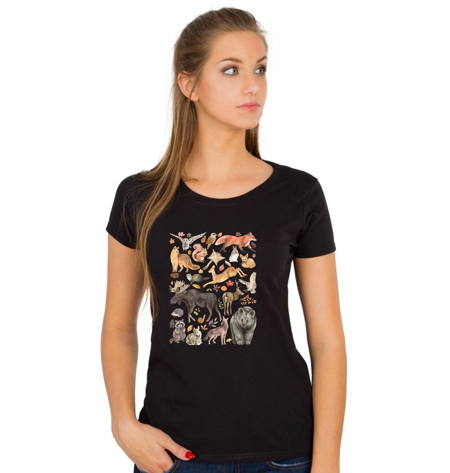 Dámské tričko Zvířata z Lesa. Rozkošný přírodní motiv, kde hlavní roli hrají zvířata a kouzelný les. Je tu malovaná liška, veverka, sova, jelen, los, mýval, rys, ježek, medvěd nebo srnka – doplněná o listí a podzimní přírodní detaily. Ideální pro všechny, kdo milují přírodu, lesní atmosféru a roztomilé ilustrace.