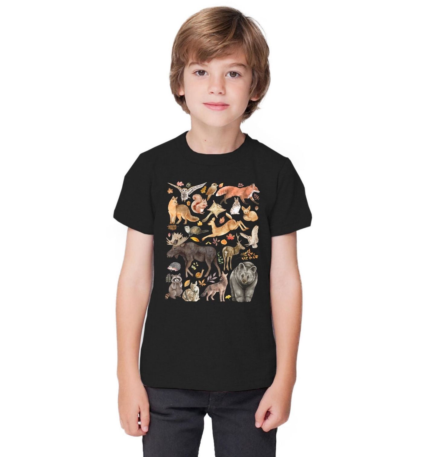 Dětské tričko Zvířata z Lesa. Rozkošný přírodní motiv, kde hlavní roli hrají zvířata a kouzelný les. Je tu malovaná liška, veverka, sova, jelen, los, mýval, rys, ježek, medvěd nebo srnka – doplněná o listí a podzimní přírodní detaily. Ideální pro všechny, kdo milují přírodu, lesní atmosféru a roztomilé ilustrace.
